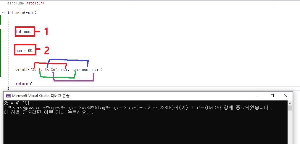 위에 뜻은 num에 65라는 값을 저장한다.